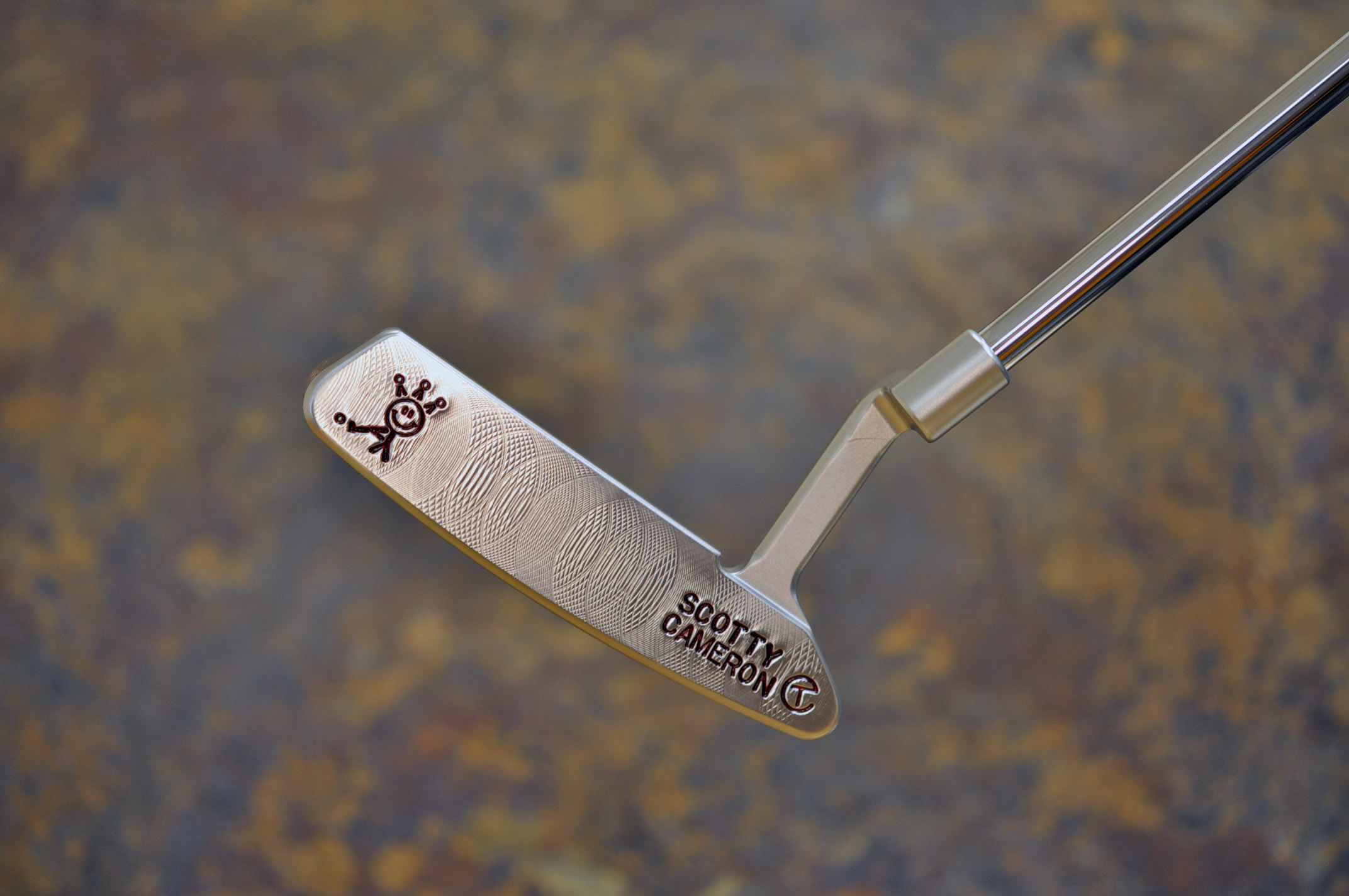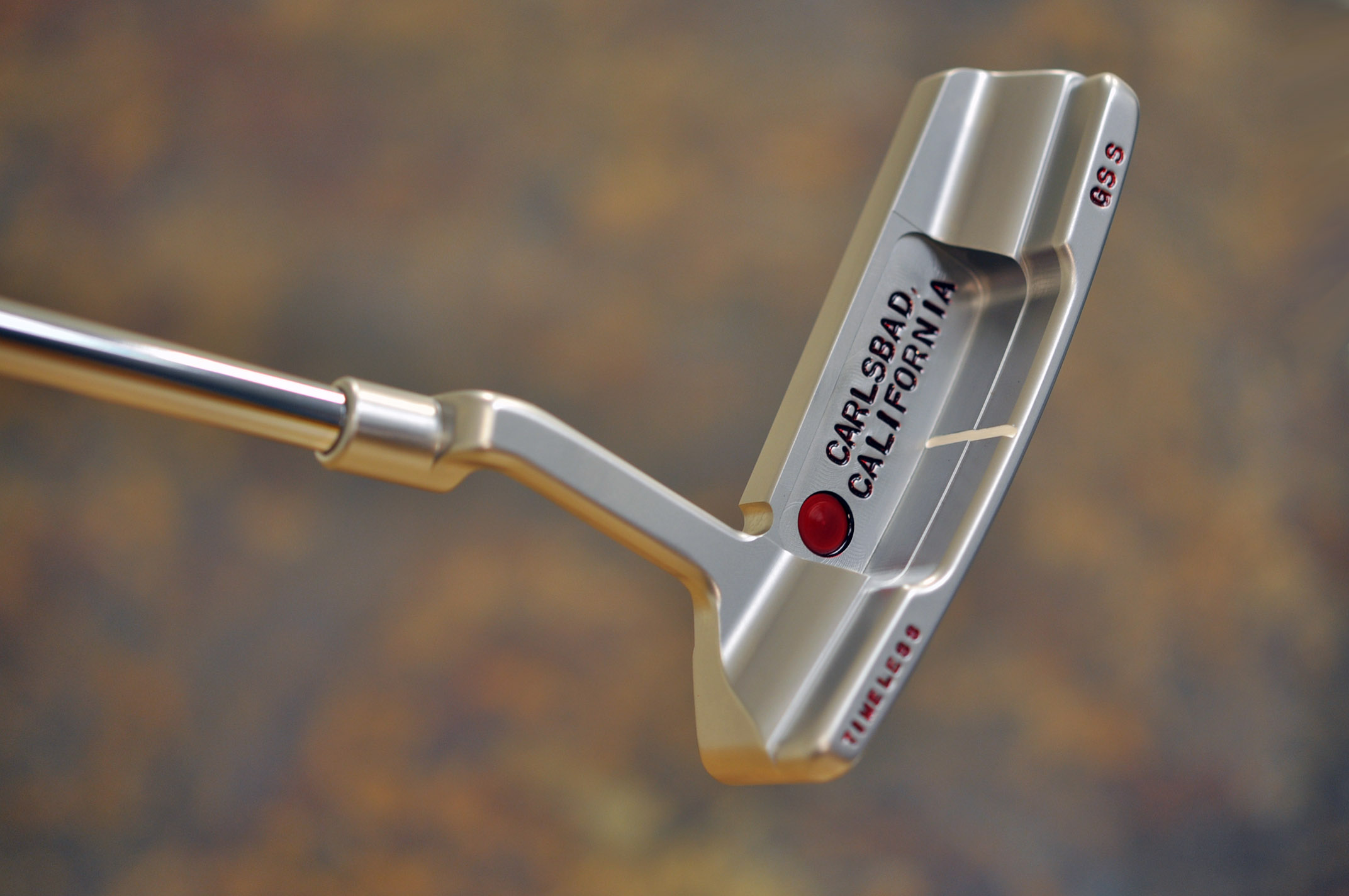 Timeless GSS Newport II at 350g with a crowned putting smiley face, a big tour dot, 'CARLSBAD', a flangeline and a circle T stamp. |