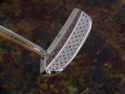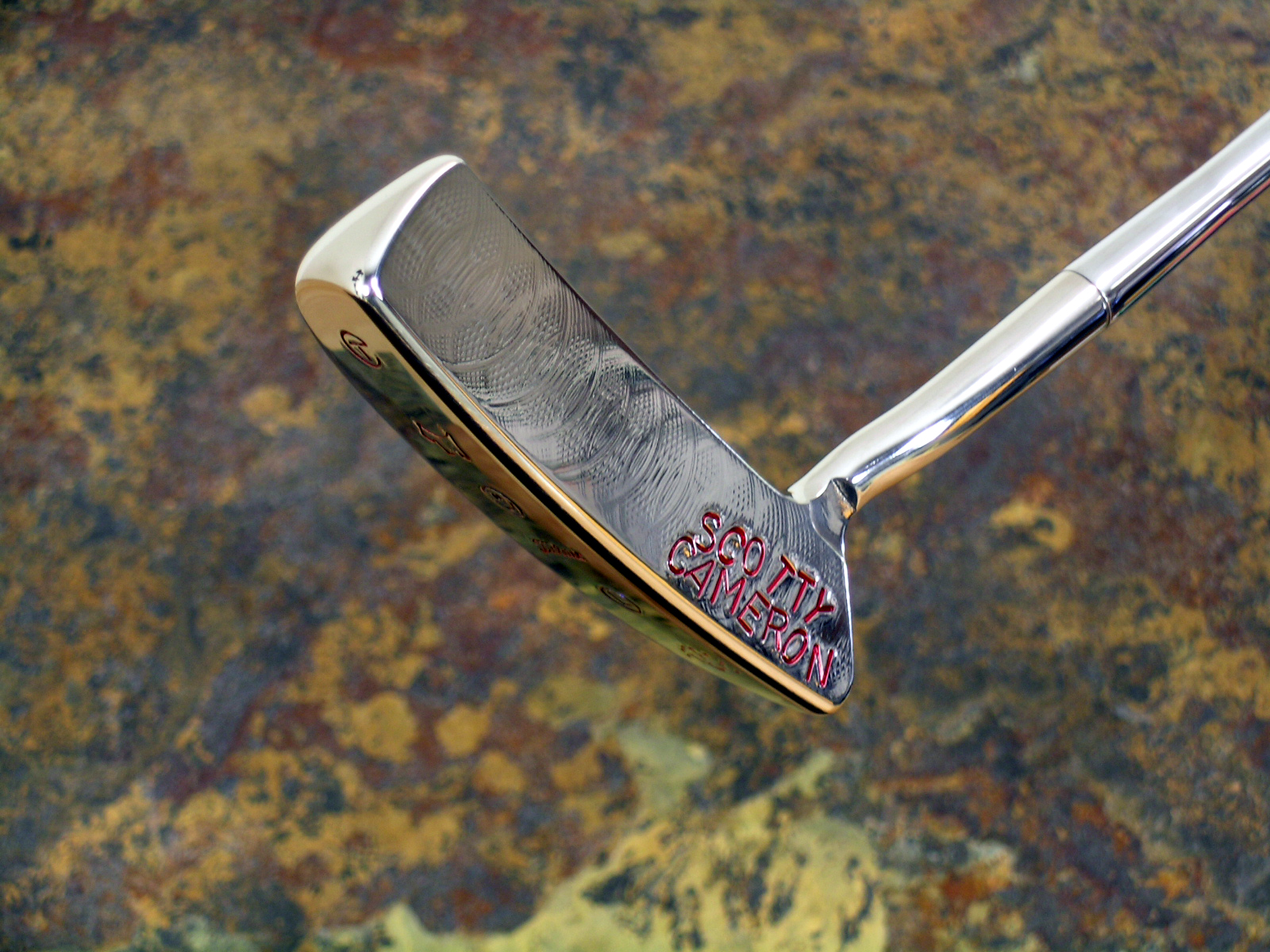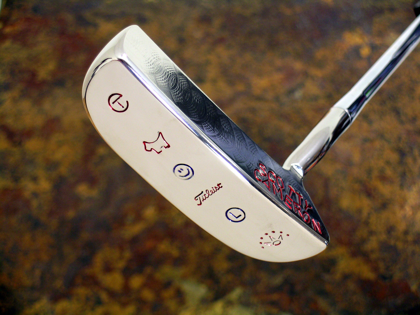 2005 Scotty Cameron Garage putter in SSS with a circle sight dot, a circle T, a scotty dog, a smiley face, a circle L, a Cameron crown and circle snow on the flange. |