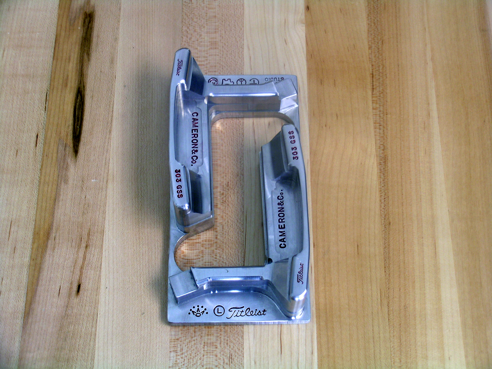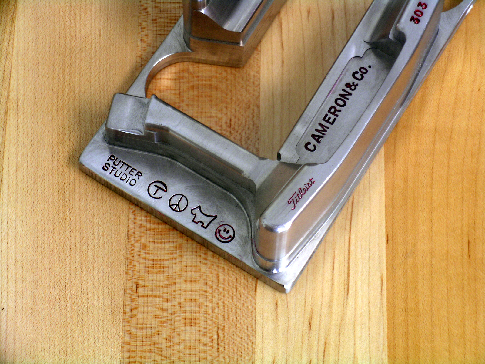 Two Cameron Co. Newport II heads CNC machined out of a GSS billet block with a circle T stamp, a circle L, a scotty dog, a smiley face, a peace sign and a Cameron crown. |