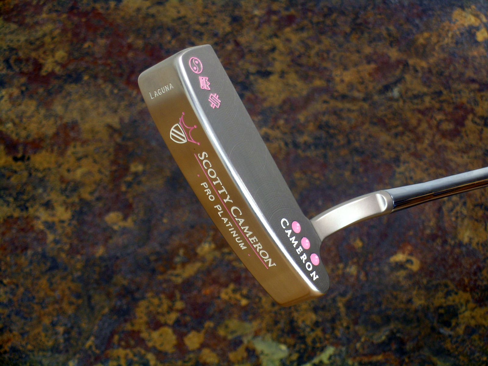 Laguna in a pro platinum finish with triple flangelines, a sight dot, a ying yang stamp, a Cameron money stamp and a custom shop stamp. |