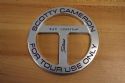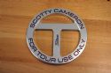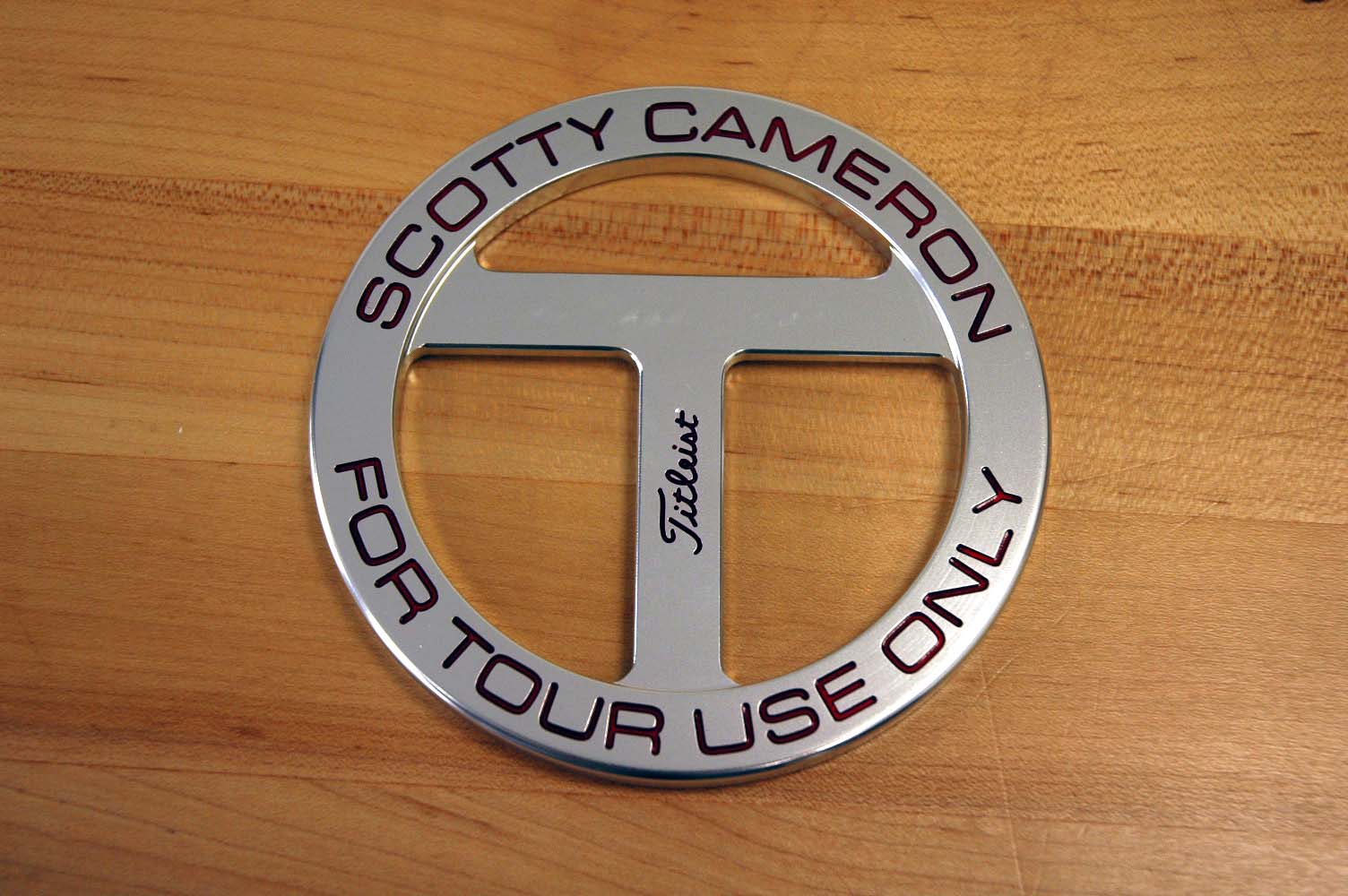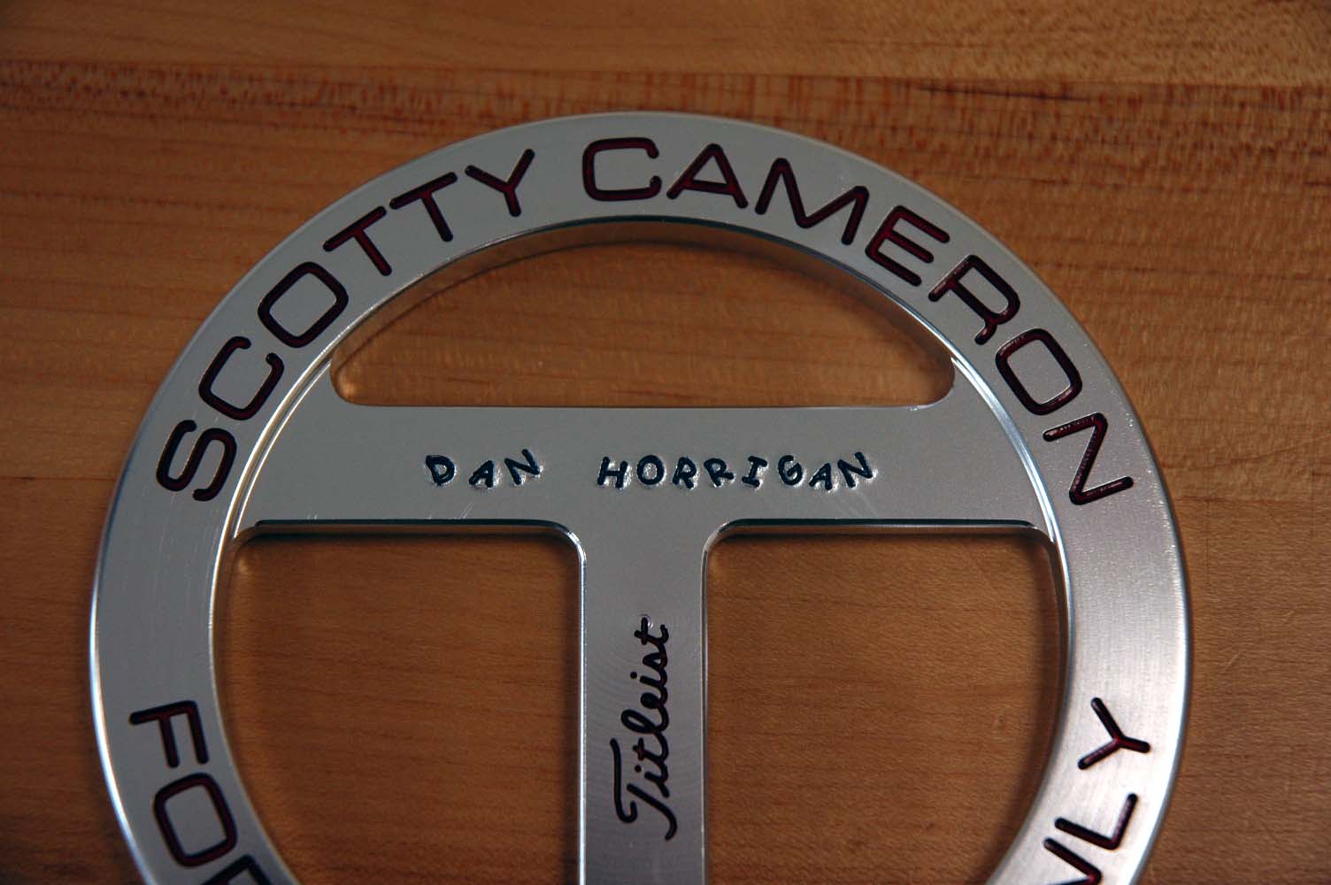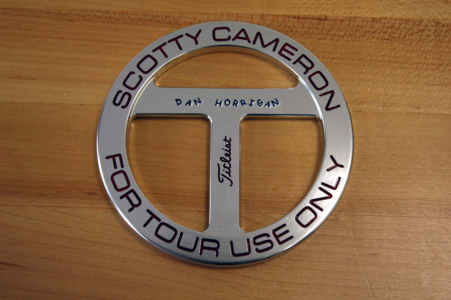 The 2006 Scotty Cameron Circle T bag tag is four and quarter inches the exact dimensions of the hole of milled aluminum. Scotty Cameron For Tour Use Only and the Titleist logo are precision engraved on both sides of the tag with handstamped 'DAN HORRIGAN' on one side. |
