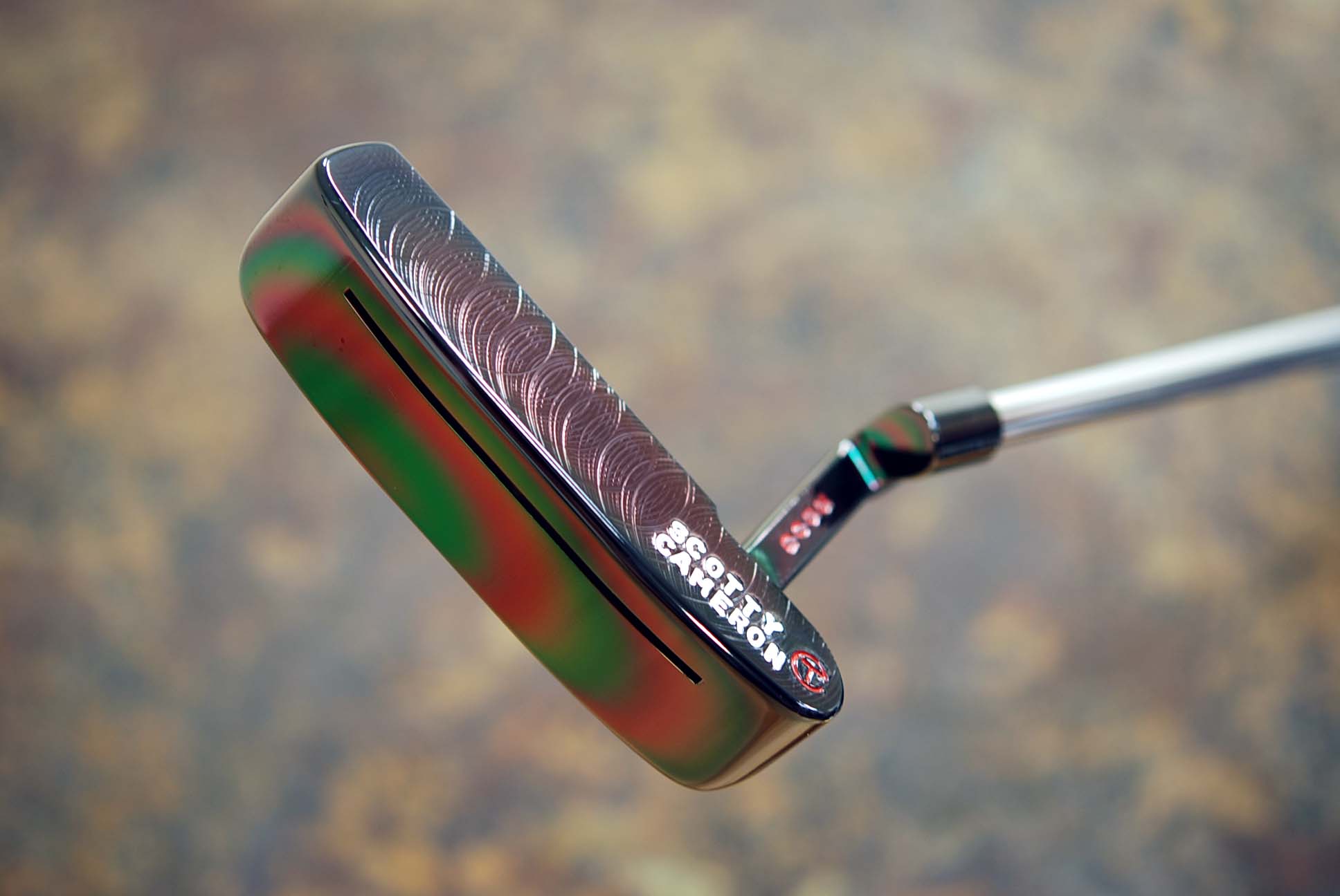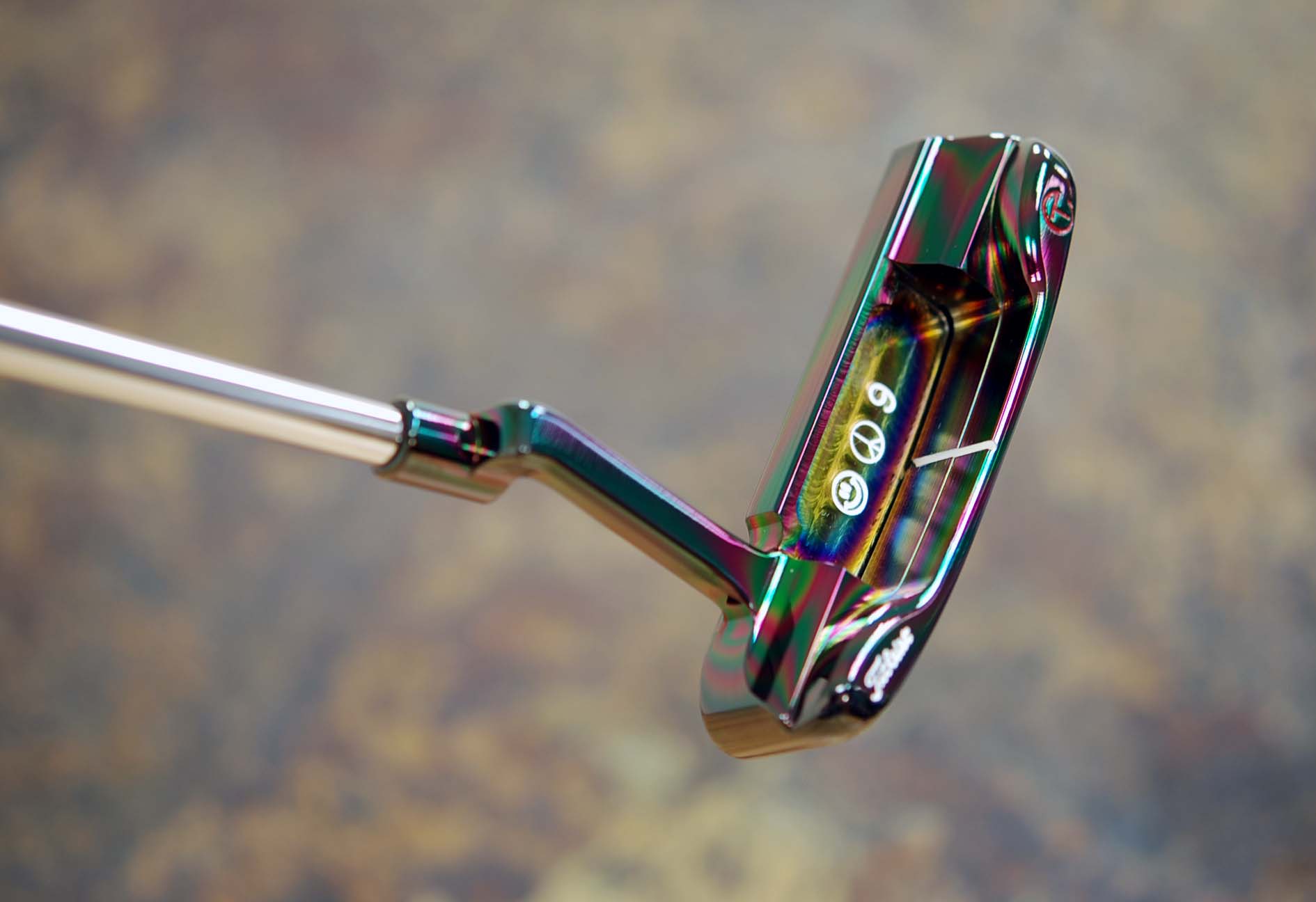 Made for the tour 009 prototype in a black pearl finish at 350g. Newport Beach style head with a flangeline, a peace sign, a smiley face and circle T stamps. |
