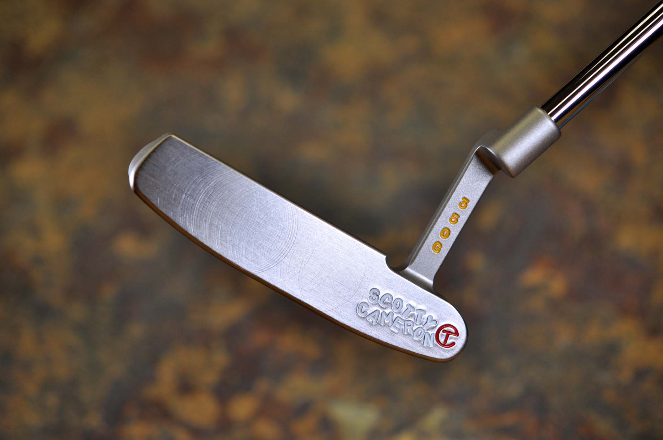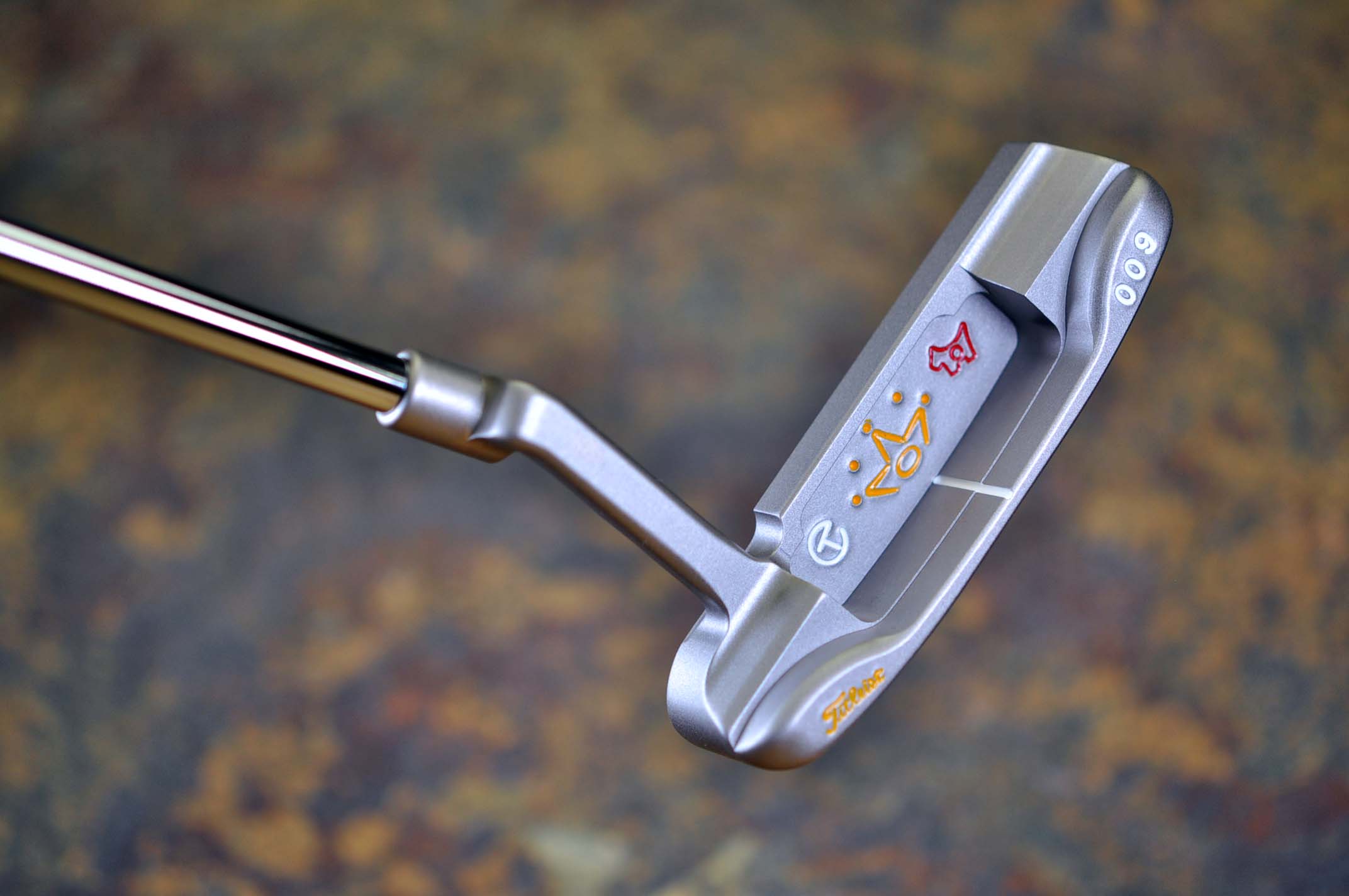 Made for the tour prototype 009 in a pro platinum finish at 350g. Newport style head with a cherry blossom scotty dog, a crown, a flangeline and circle T stamps. |