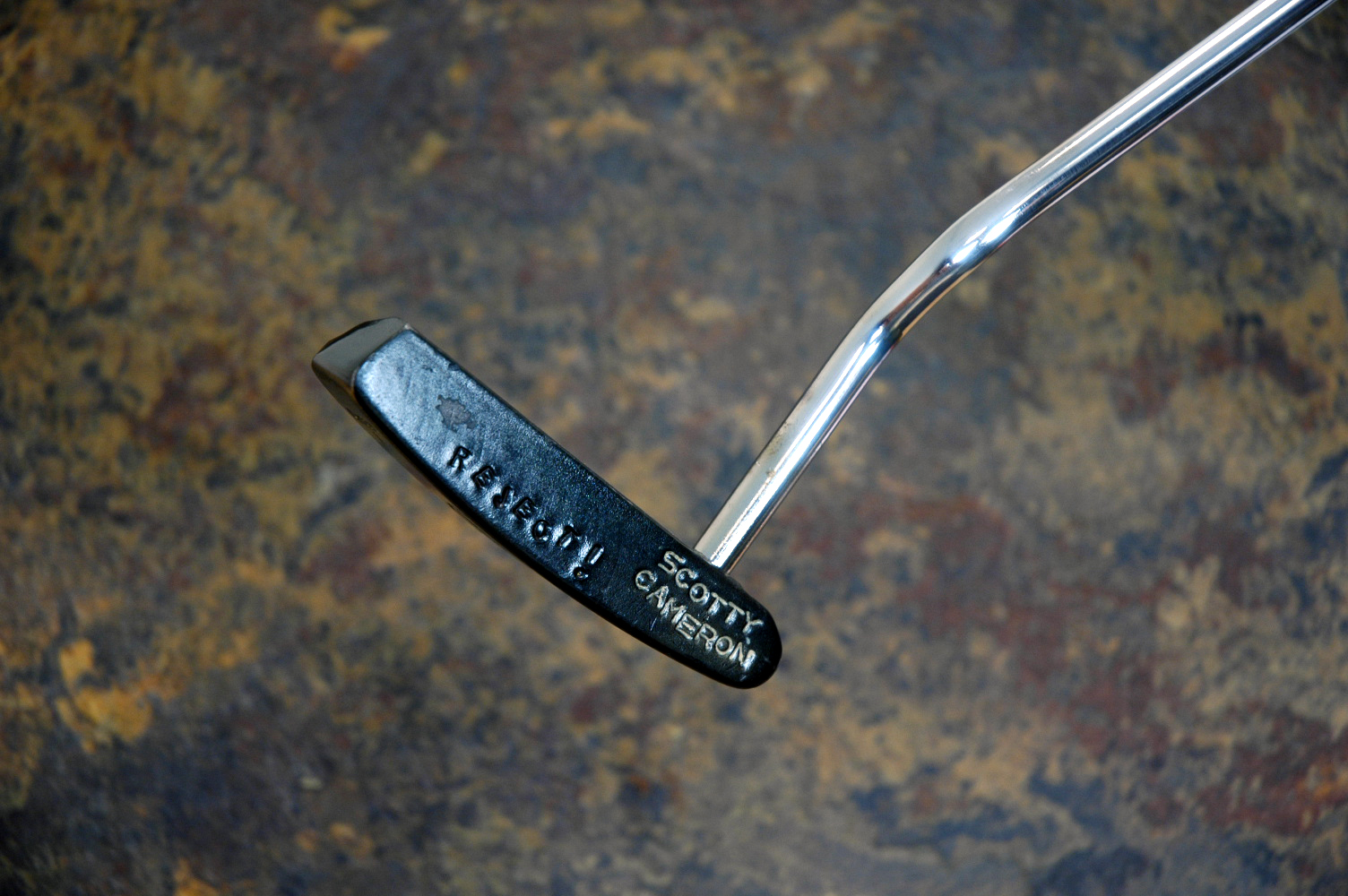 Scotty originally took this 1993 Masters Victory putter and cut the neck off to make an early Classic X. The head was too light and not meant to be used so Scotty stamped 'REJECT!' on the face. The finish, shaft and paintfill has been modified since then. |