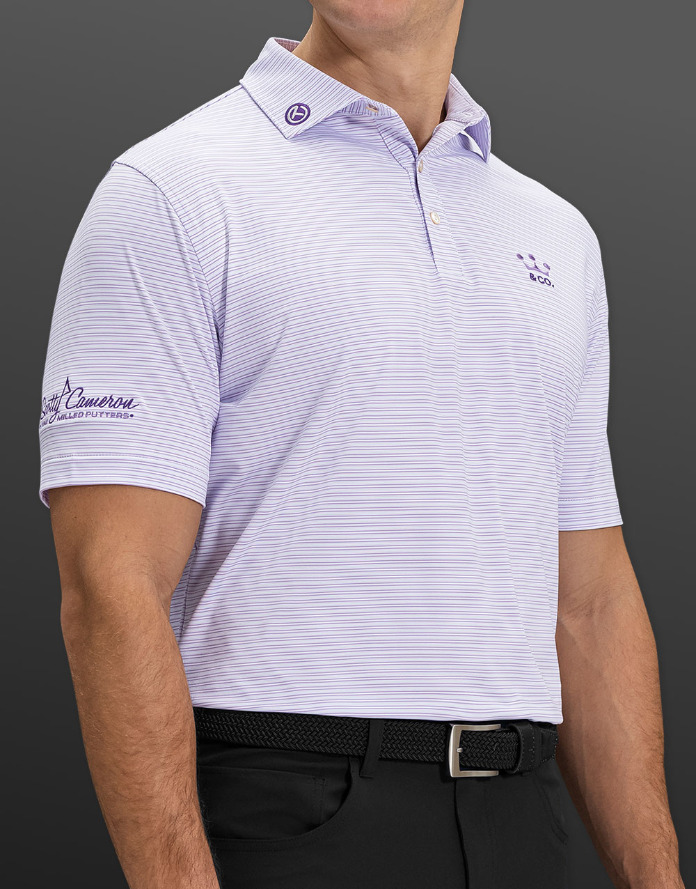With Scotty's Crown & Co. emblem expertly embroidered on the chest, a Circle T on the collar and a PinFlag on the sleeve, this new 92% polyester / 8% spandex striped Summer Comfort Harrington performance polo in white and purple iris will make a great addition to your wardrobe. This colorful shirt comes in a classic fit with four-way stretch, moisture wicking and easy-care properties.