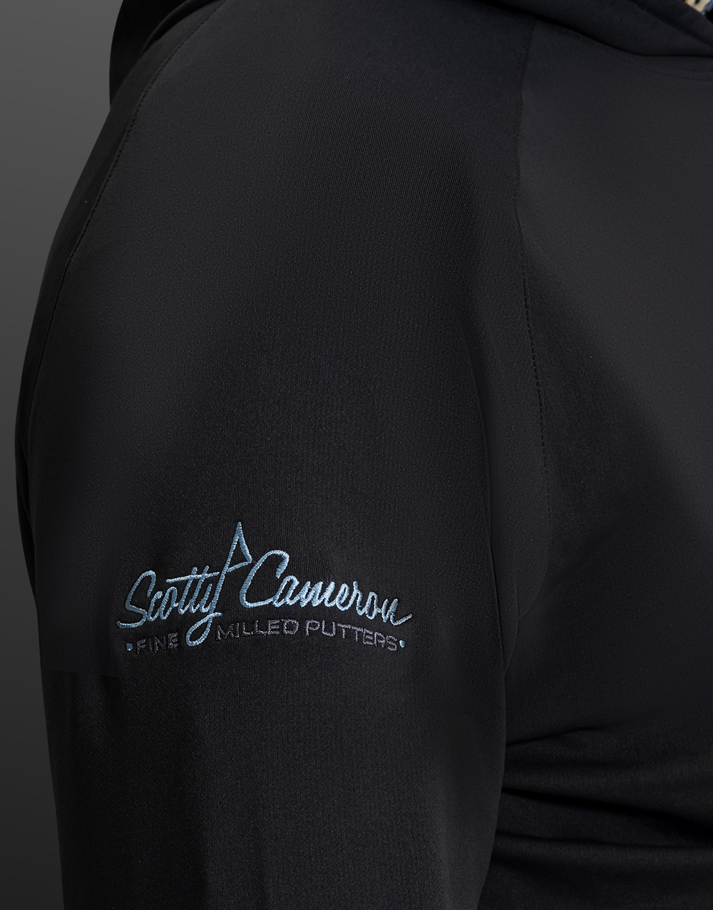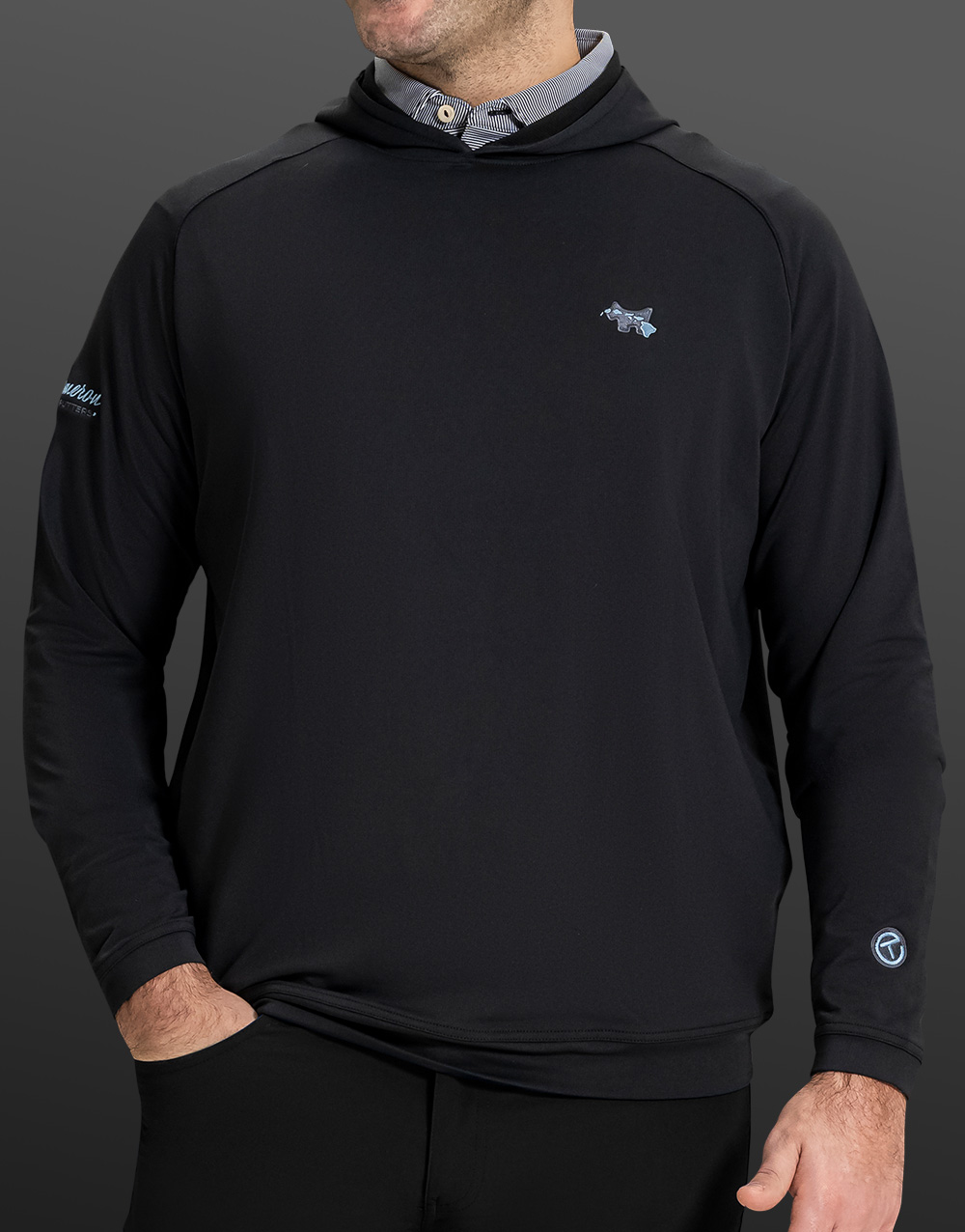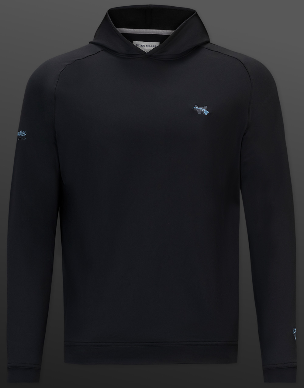 An expertly embroidered Island Scotty Dog scene adorns this luxurious hoodie, crafted from a signature performance fabric (89% polyester / 11% spandex hoodie) that stretches and wicks moisture with a smooth front and micro-waffle back for softness and breathability. With a classic fit to match its looks, this handsome, easy-care hoodie in black also features an expertly embroidered Circle T and PinFlag sleeve treatment. It's finished with raglan sleeves, clean banded cuffs and a banded hem.