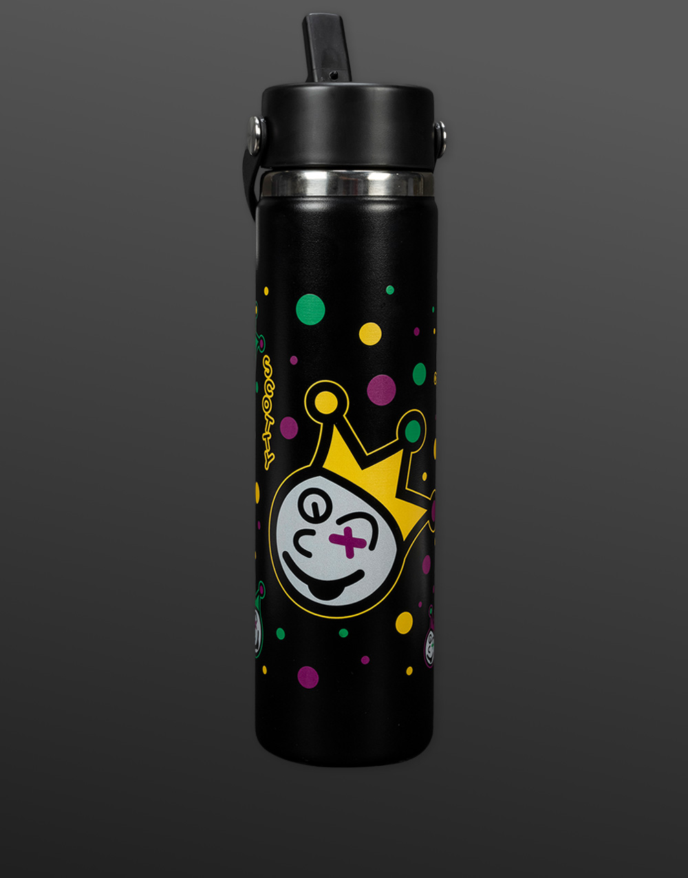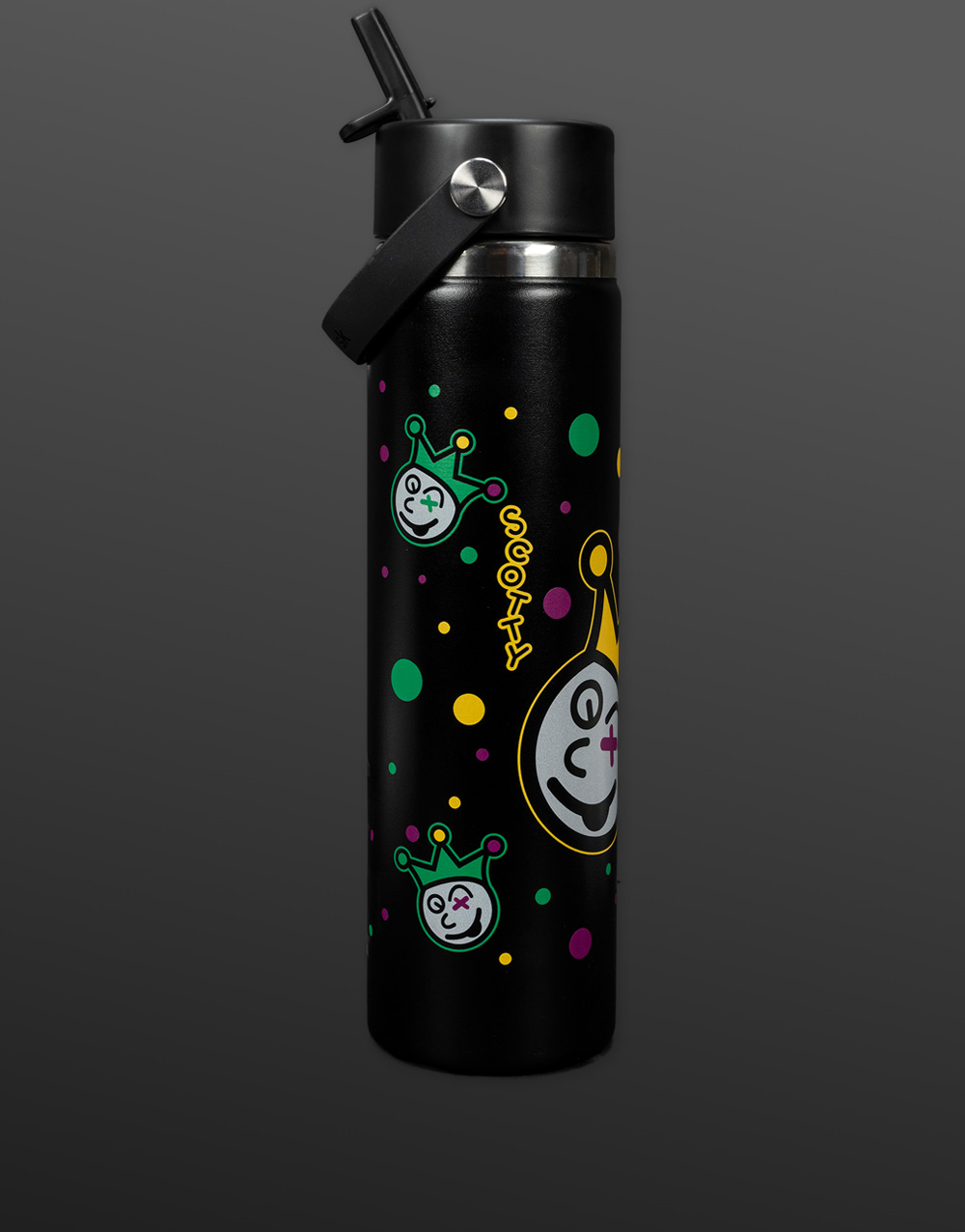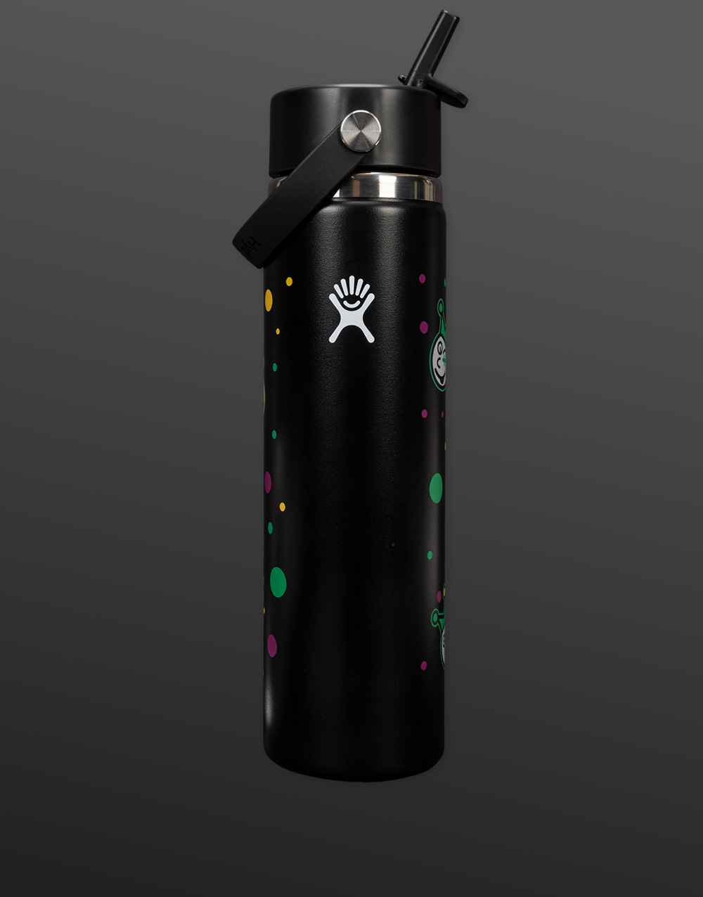 Custom made with a Mardi Gras-themed Jackpot Johnny design, this 24 oz Wide Mouth with Flex Straw Hydro Flask has a comfortable, flexible handle and a straw cap that's easy to operate with one hand for on-demand hydration. Trademark TempShield™ insulation keeps drinks cold up to 24 hours in a slim, cupholder-friendly format that's dishwasher safe with pure taste and leakproof performance.Â