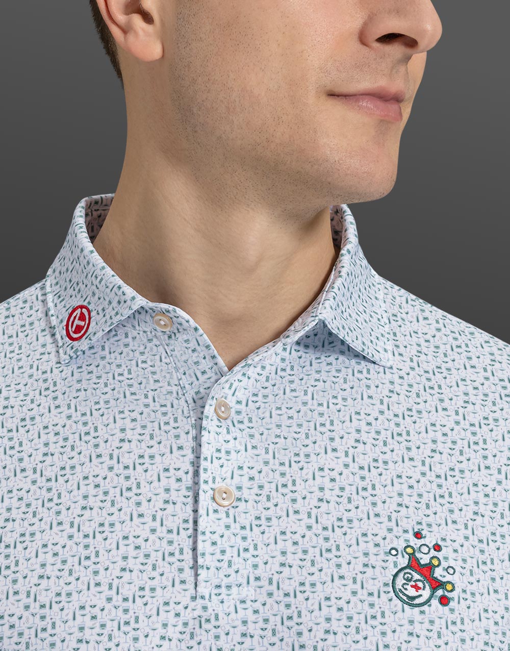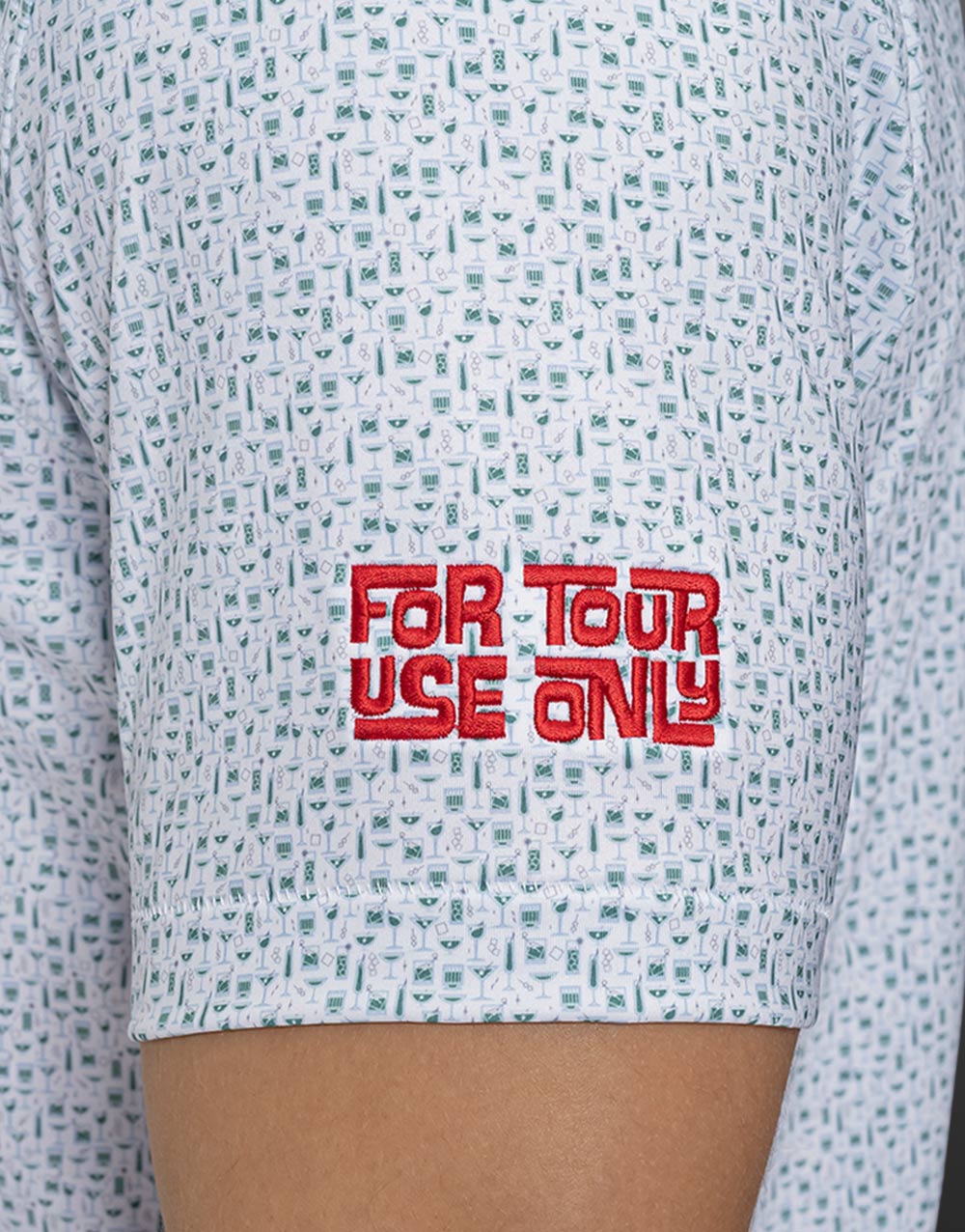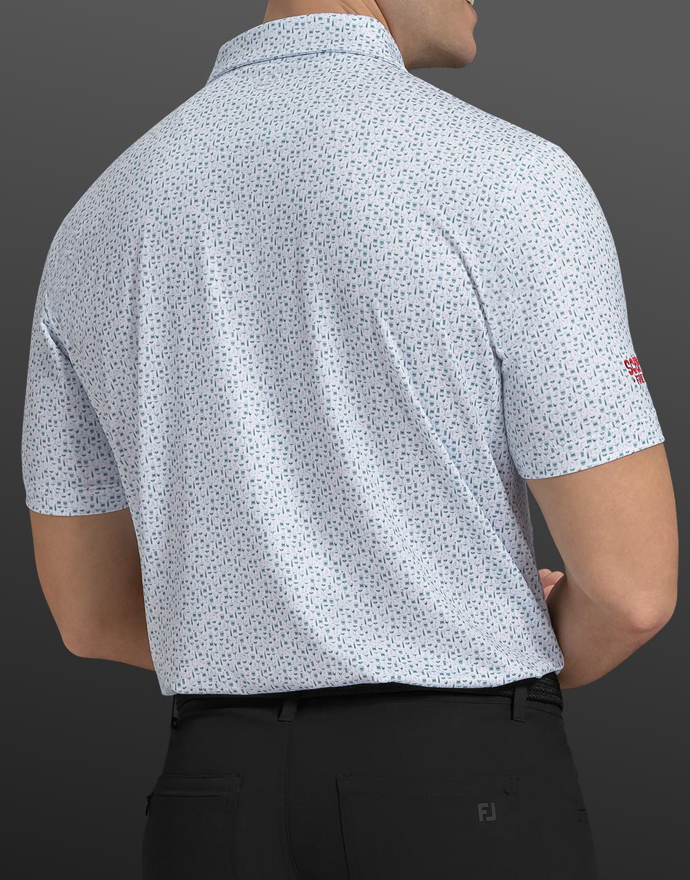 Made for a major week and sporting a vibrant pattern created with various cocktail vessels, this Cheers performance polo shirt combines comfort and durability with premium Summer Comfort fabrication (92% polyester and 8% spandex) for easy-care, breathable performance. In addition to our expertly embroidered Jackpot Johnny and Circle T emblems—and joining our SC Malibu sleeve treatment—is an additional For Tour Use Only badge on the other sleeve in matching style.