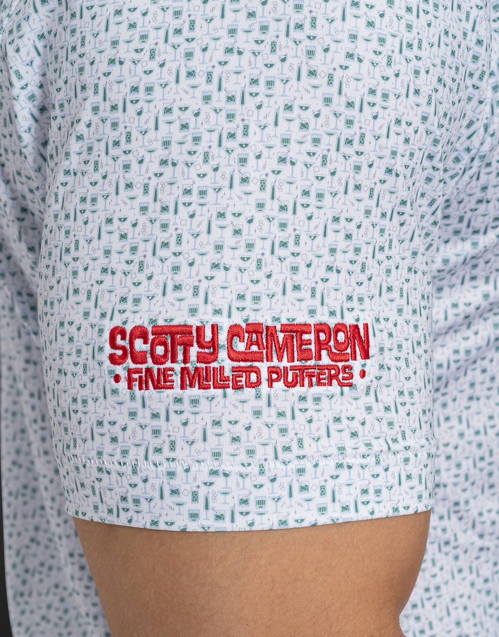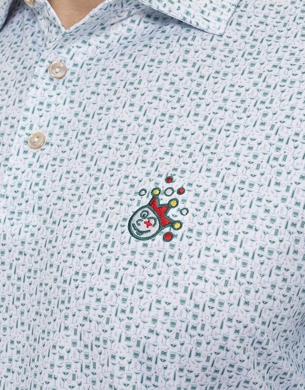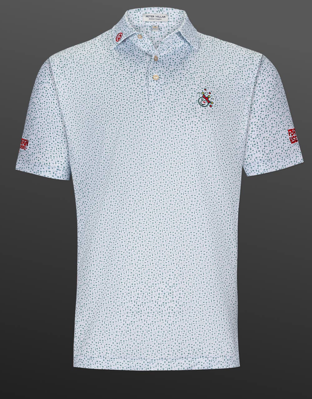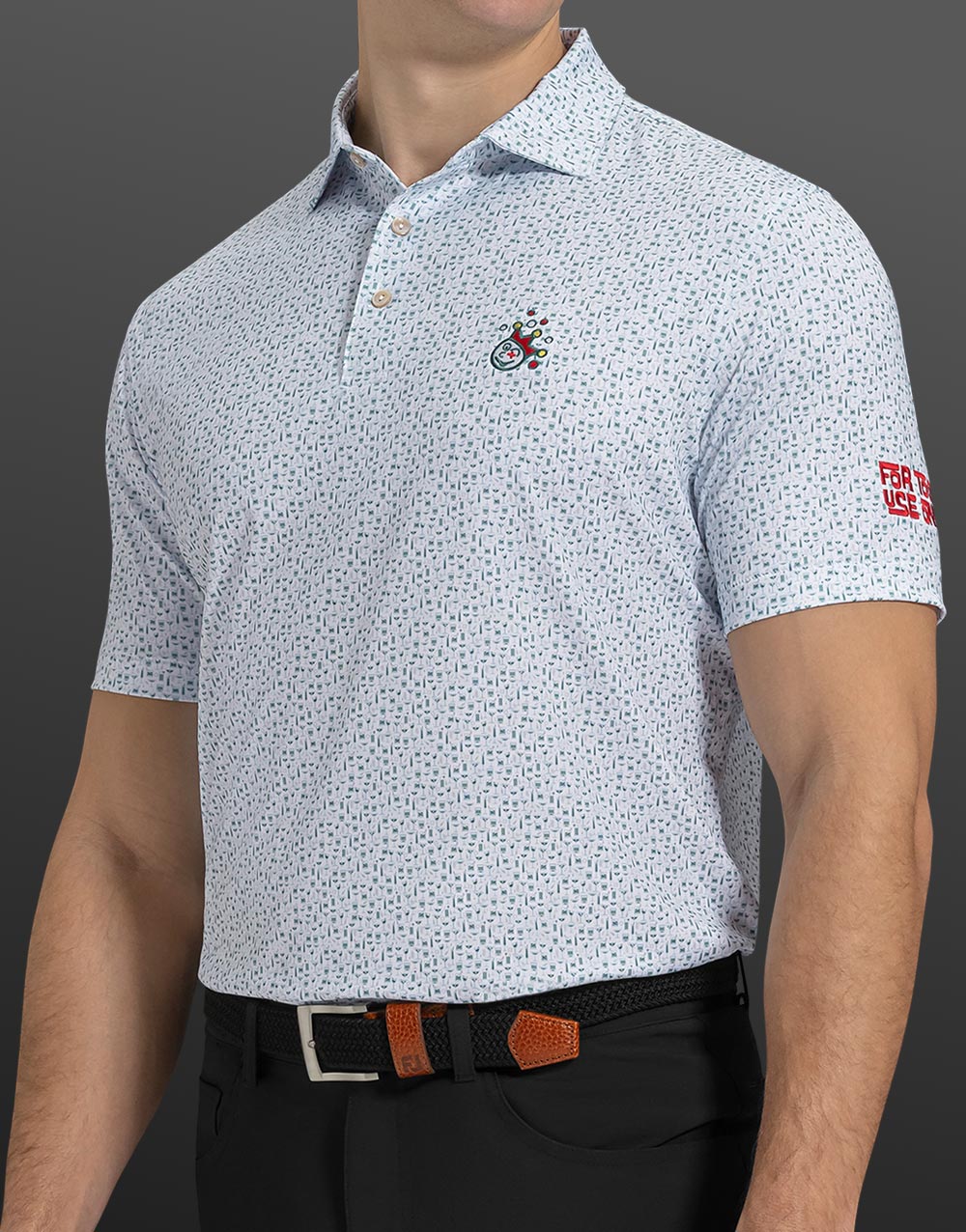 Made for a major week and sporting a vibrant pattern created with various cocktail vessels, this Cheers performance polo shirt combines comfort and durability with premium Summer Comfort fabrication (92% polyester and 8% spandex) for easy-care, breathable performance. In addition to our expertly embroidered Jackpot Johnny and Circle T emblems—and joining our SC Malibu sleeve treatment—is an additional For Tour Use Only badge on the other sleeve in matching style.