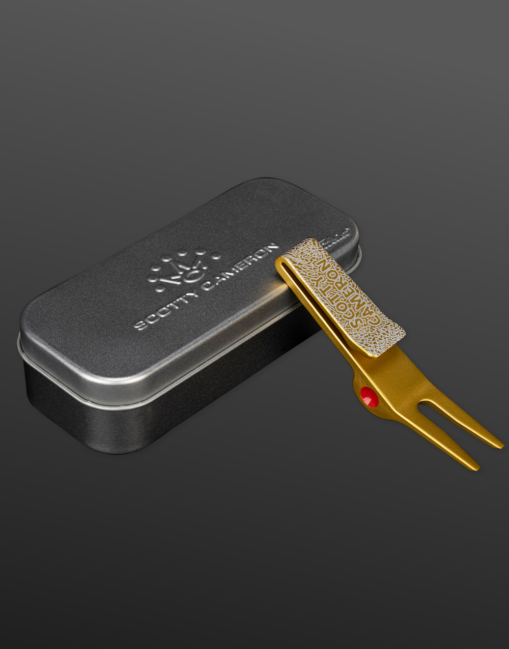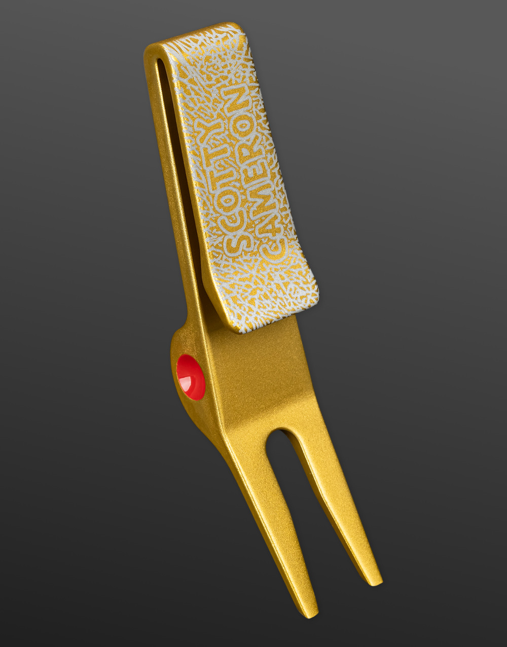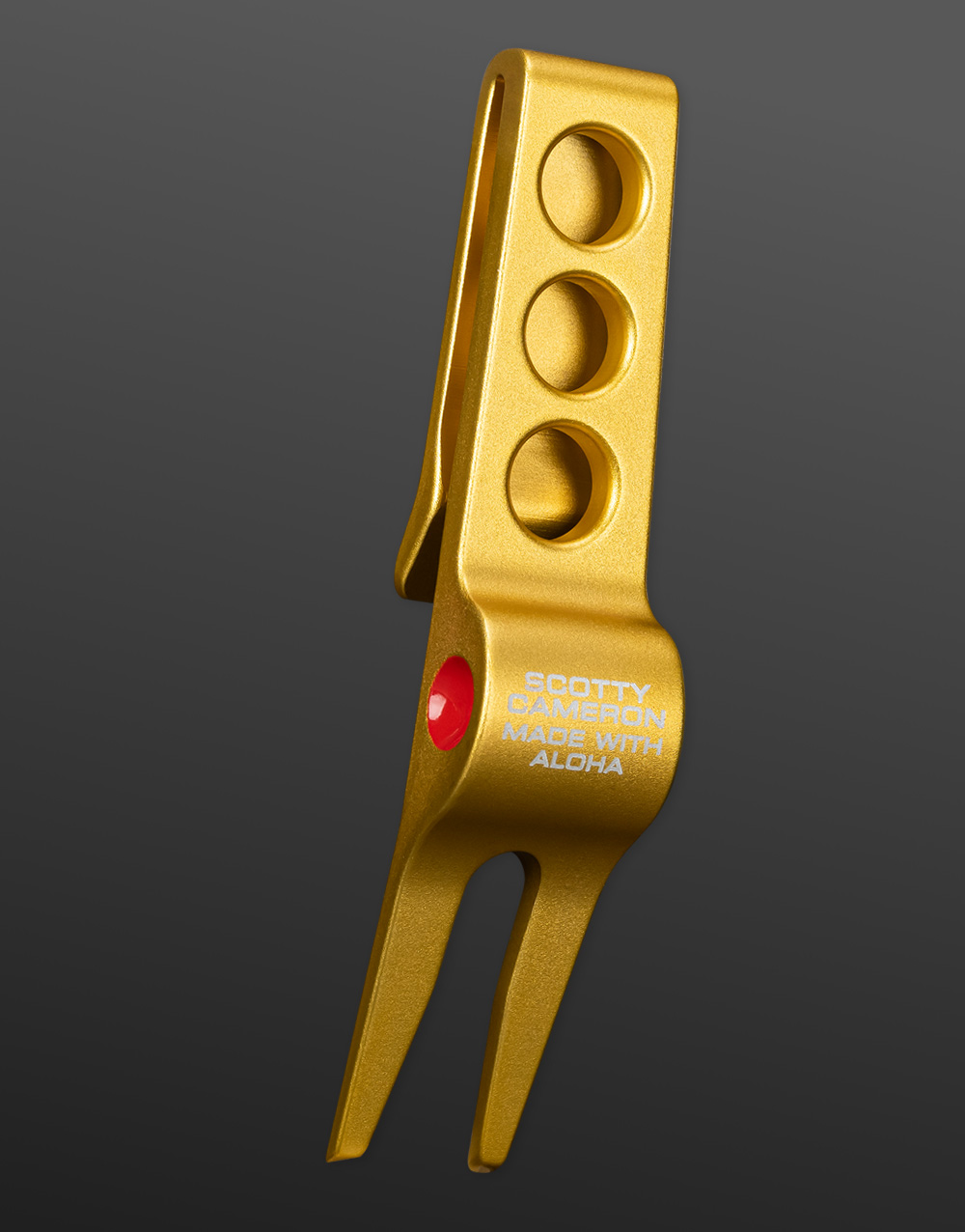 Made with aloha and expertly laser etched to show it, this precision milled aluminum clip pivot tool anodized in misted bright dip gold is a better way to fix ball marks. It also includes our custom made Hawaiian Open Lava Walk design, as well as eye-catching pops of red paint on the milled dots.