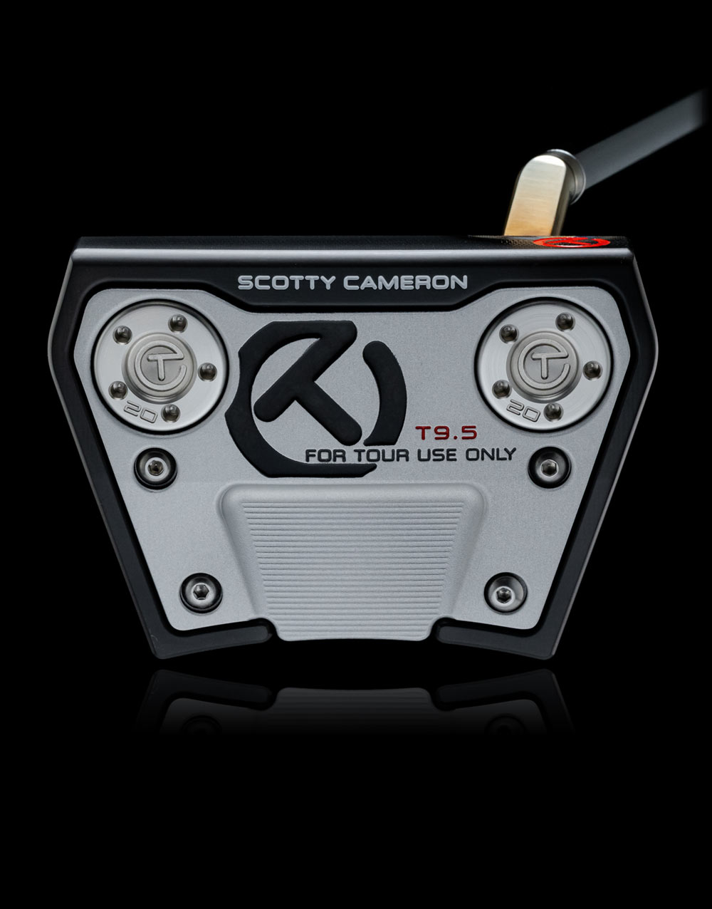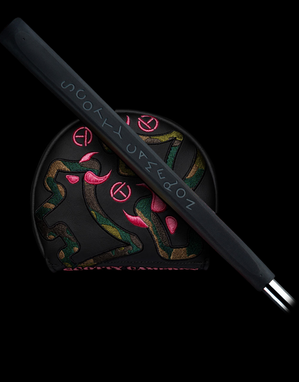 This 34-inch Phantom T9.5 Prototype has Scotty's Tour Black finish and a welded, polished jet neck with a hand-flamed Chromatic Bronze hue. This precision milled compact mallet includes a custom sight line, contrasting aluminum sole plate, a Tour Only Pistolero grip and a pink-accented Camo Bulldog Circle T mid-round headcover.