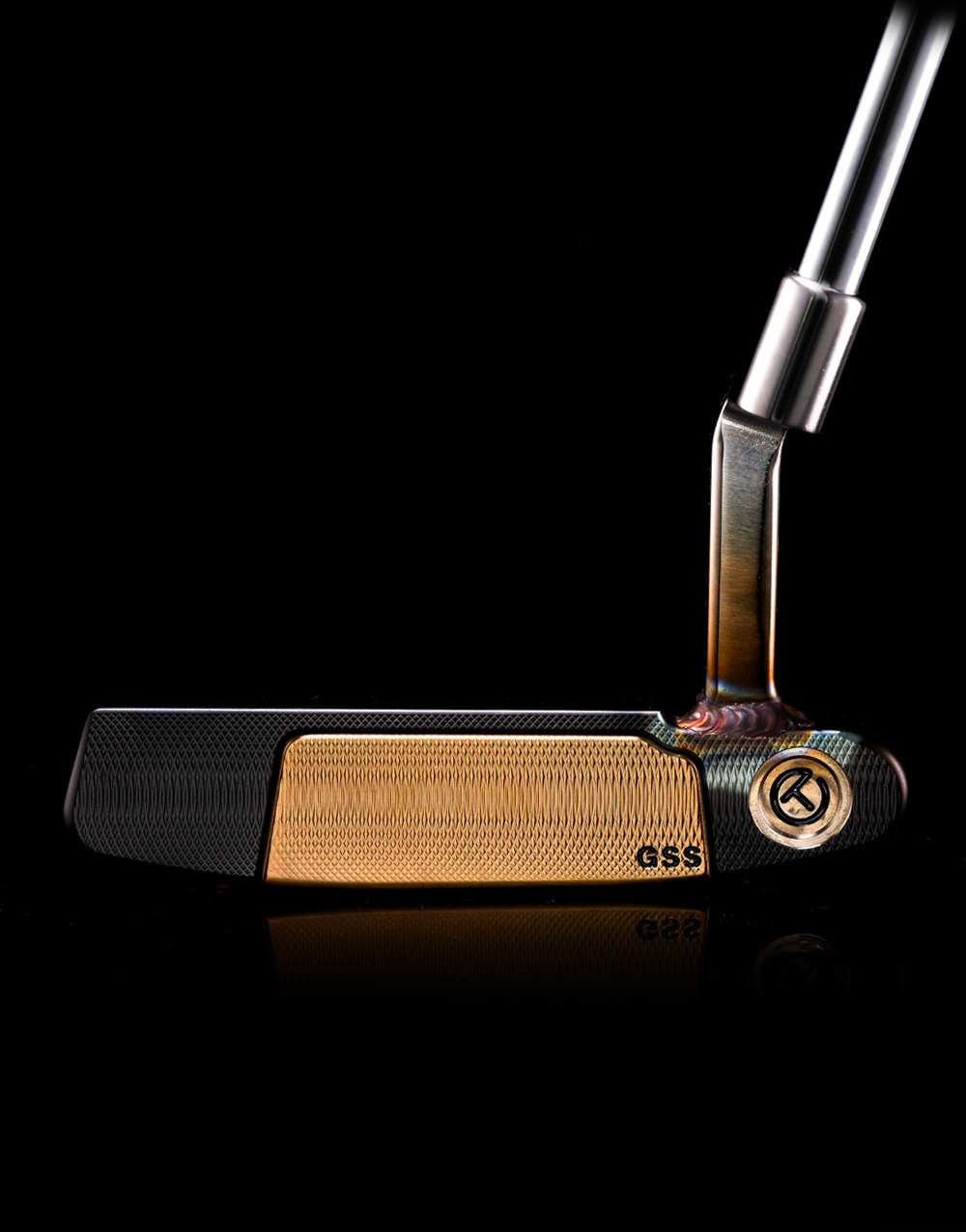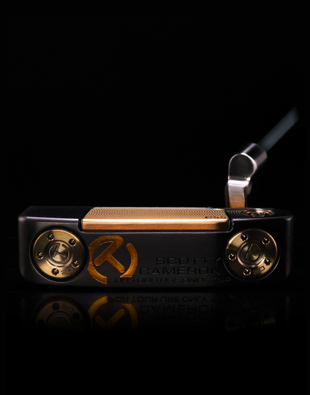 This 34-inch Select Newport (TNP) Prototype includes a Tour Black finish with a Chromatic Bronze finish on the GSS inlay and Circle T sole weights with a tinge of color added to the welded, polished plumbing neck, as well. Accented in Tequila Sunrise translucent paintfill, it also includes a Smoky Stick Figure Circle T headcover and a Scotty Cameron Cord No Cord grip.
