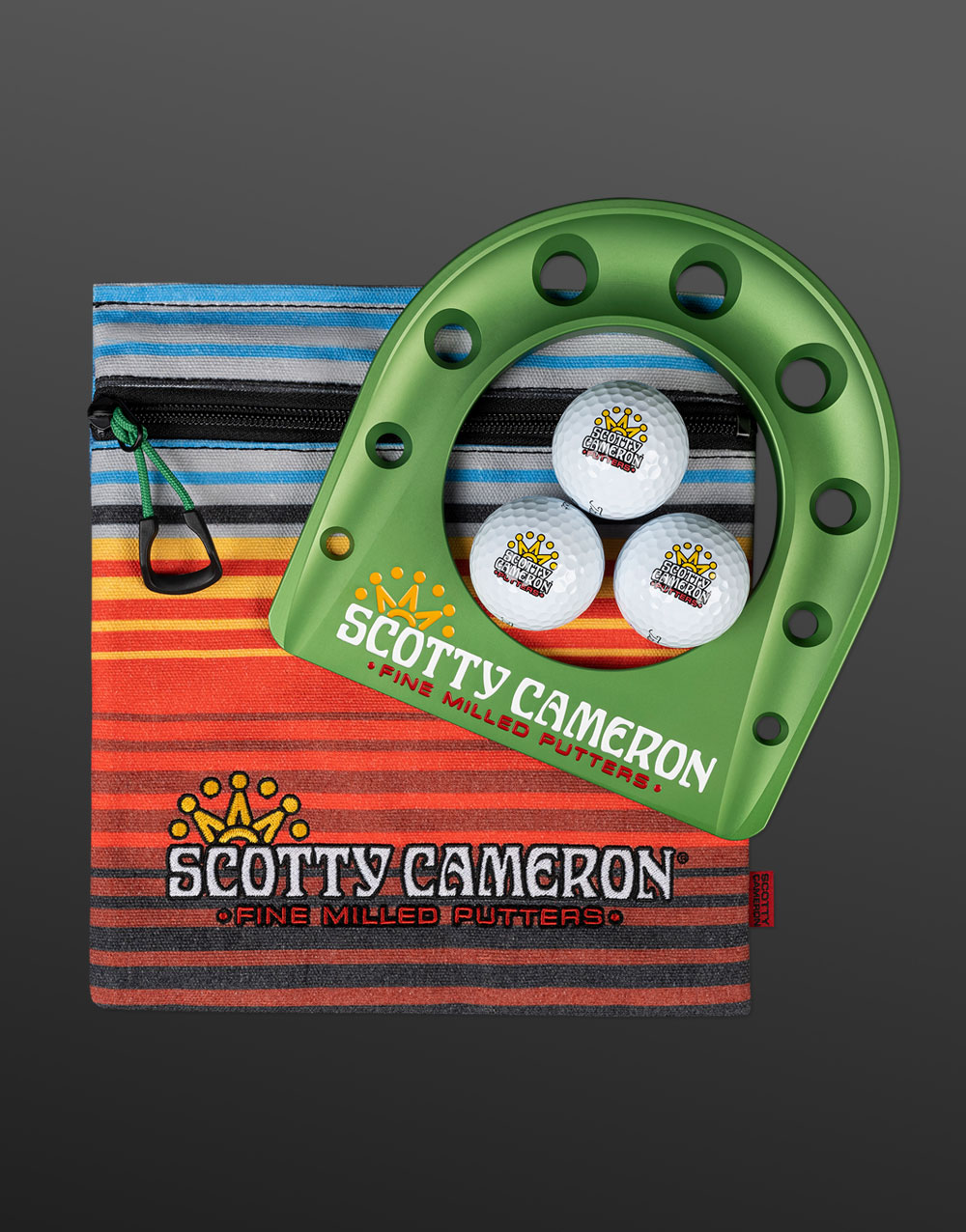 Putt anywhere with the Serape Crown putting cup kit. Anodized in bright dip green, Scotty’s milled aluminum putting cup comes with a custom crafted canvas carry bag featuring a Serape Crown pattern that will vary in color according to the cut of the fabric, as well as three custom Scotty Cameron 7 Point Crown imprinted Titleist Pro V1 golf balls.