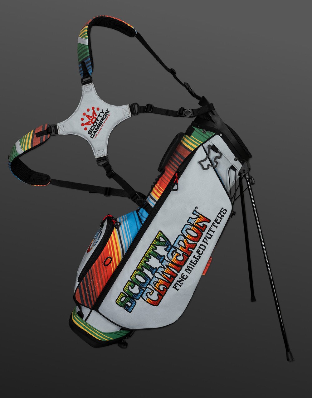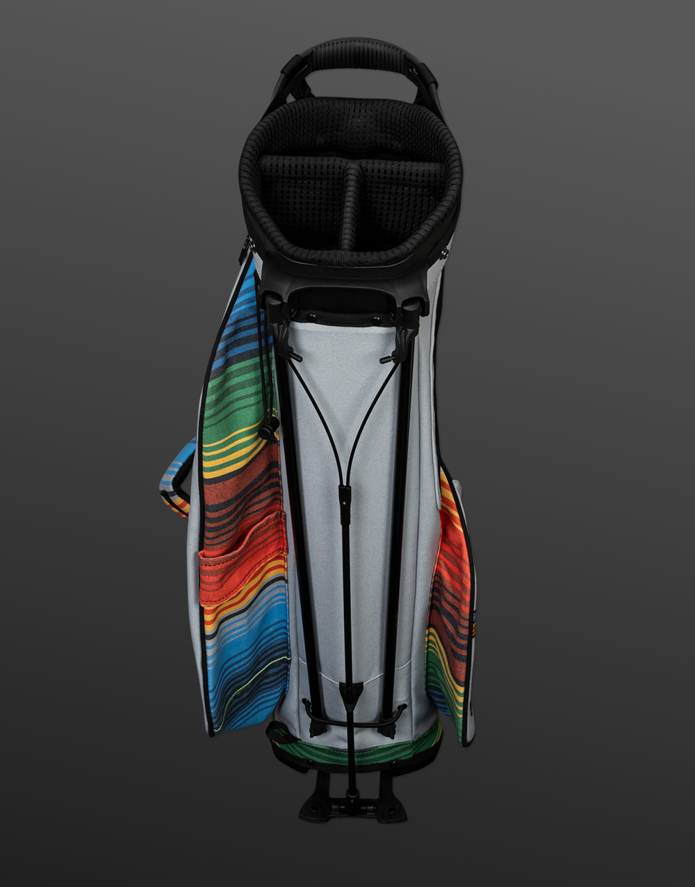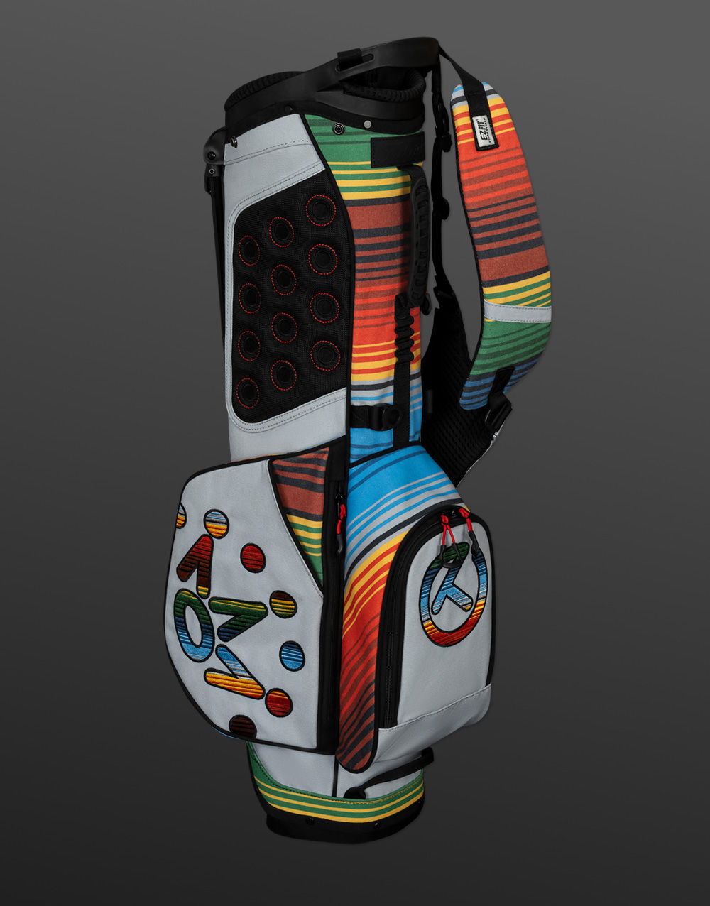 Our Serape Wanderer carry bag was made for a quick nine or the whole day. It's your call. With an 8” x 9” divided top there’s room for 14 clubs with the option for a single or dual-strap setup. Three big pockets, a drink holder, handy tee stows, an umbrella sheath and a matching rain hood make this bag extremely useful, not to mention eye-catching with its Cinco de Mayo-themed color scheme. Note: The serape color pattern will vary depending on the cut of the fabric.