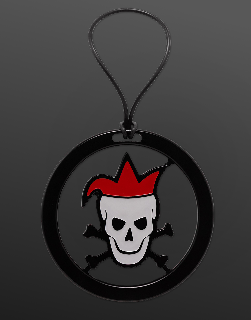 Precision milled from aircraft-grade aluminum and anodized black, this Tour Jester bag tag is hand-painted and doubles as a practice putting target, as it's the same size as a real cup (4.25" diameter). Set it on the green and putt to it if you like. Freshly milled and made courtesy of Scotty's Design Studio, it includes an o-ring for easy attachment.